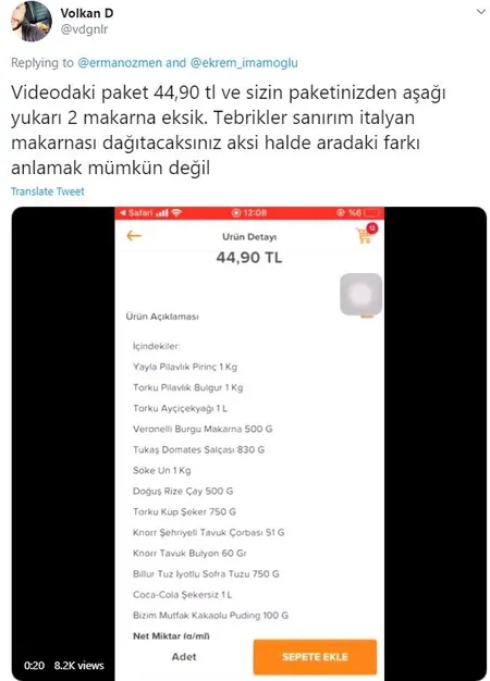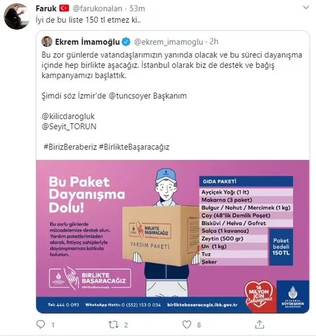 Fakat İmamoğlu'nun başlattığı destek kampanyasındaki gıda kolisinin fiyatı tepki çekti. Öyle ki İBB Başkanı Ekrem İmamoğlu, birçok yerde muadillerinin 50 ile 100 TL arasında değiştiği gıda paketi için 150 TL talep etti.