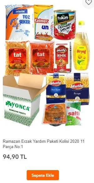 İşte bir başka örnek! 11 parça gıdanın bulunduğu uyardım paketi 94,90 TL: