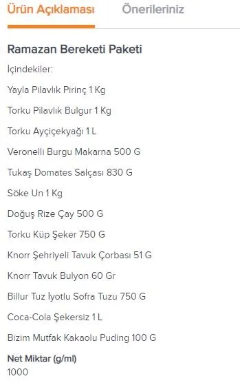 İşte 44.90 TL'lik bir gıda paketi örneği ve içeriği: