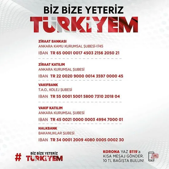 "Vatandaşlarımızdan da arzumuz, gerek 8119'a SMS göndererek gerek kamu bankalarındaki hesaplara güçleri yettiği kadar katkı vererek, bu birlik ve beraberliğin sembolü olmaları, bir ve beraber olarak tarih yazmaları önemli. Biz elimizden geleni sonuna kadar yapıyoruz. Bundan sonra da yapacağız. Bu virüsü de bu sıkıntıyı da hep birlikte bir ve beraber olarak çok güçlü bir şekilde atlatacağız. Bu süreci, çocuklarımıza, birlik ve beraberlik örneği bırakacağımız bir dönem olarak hatırlayacağız."