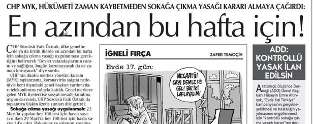 Çin, AB ve ABD koronavirüs faciasına tedbirsizlikleri yüzünden binlerce kurban verirken, Türkiye erken davranarak aldığı tedbirlerle virüsün ülkeye sıçramasını geciktirdi ve etkisini çok sınırlı tutmayı başardı. Türkiye'nin başarısını görmezden gelen bazı kesimler, sokağa çıkma yasağı üzerinden provokasyona başladı. Sokağa çıkma yasağı üzerinden hükümete baskı yapanların amacı ne yazık ki vatandaşın sağlığı değil. Özellikle dış basının da sıkça desteklediği bazı kesimler, üretimin durması, tedarik zincirinin kırılması, mafyacılığa ve stokçuluğa gün doğması, sokakların askere teslim olması ve özellikle ekonomik dar boğaza girilip IMF'den borç istenmesi derdinde.
