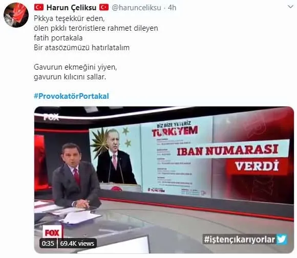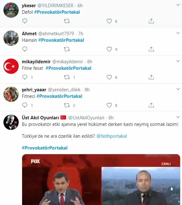 Vatandaşlar, Fatih Portakal'ın provokasyonuna sosyal medyada tepki gösterdi. ABD sermayeli FOX'un ABD tetikçiliği yaptığı yönünde yorumlar yapan vatandaşlardan tepki yağınca #ProvokatörPortakal Twitter'da trend topic oldu.
