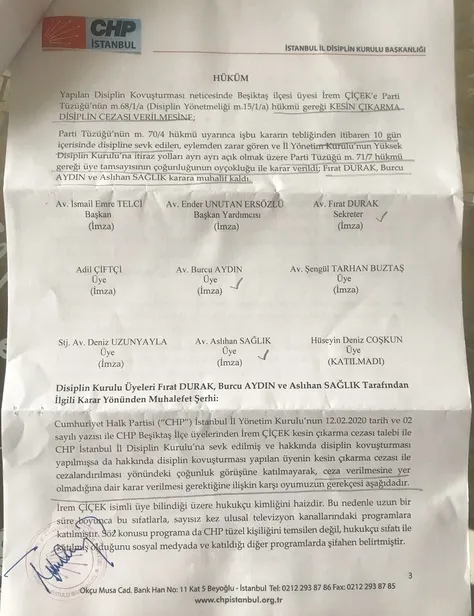 Partilerin sözde özgürlükçü ve demokrat olmak yerine özde bu ilkeleri benimsemeleri adına, CHP yönetiminin bol keseden verdiği bu ve benzeri ihraç kararlarına, yani yönetimdeki bu zihniyete karşı mücadele edeceğim. Kişi partiyi temsilen çıkmıyorsa hangi kanala çıkıp, çıkmayacağına yine kendisi karar verir. Parti yönetimi de üyeler için böyle bir karar alamaz. Niyetim bir avukat olarak yargıdan çakacak kararı görmek. Bizde haksızlığa karşı mücadele azmi bitmez. Sonucu sizlerle paylaşacağım. Sonuçta çıkacak karar her ne olursa olsun hayrıma olacaktır.