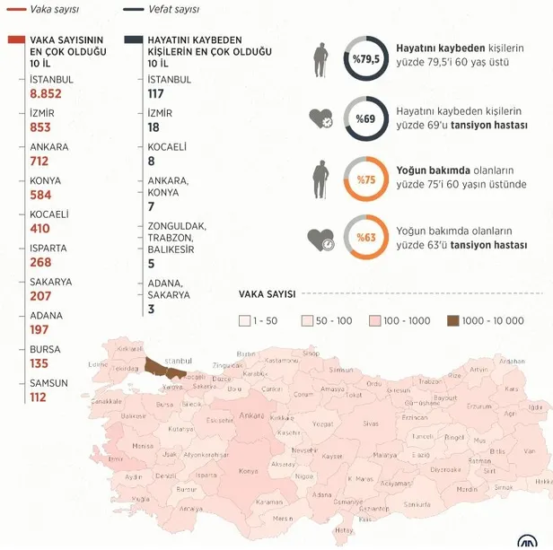 Hayatını kaybedenlerin 79,5'u 60 yaş üstü. Yoğun bakımda olanlardan 74,5'i 60 yaş üstü. Kronik hastalığı olarak yoğun bakımda olanlar ise yüzde 75'te.