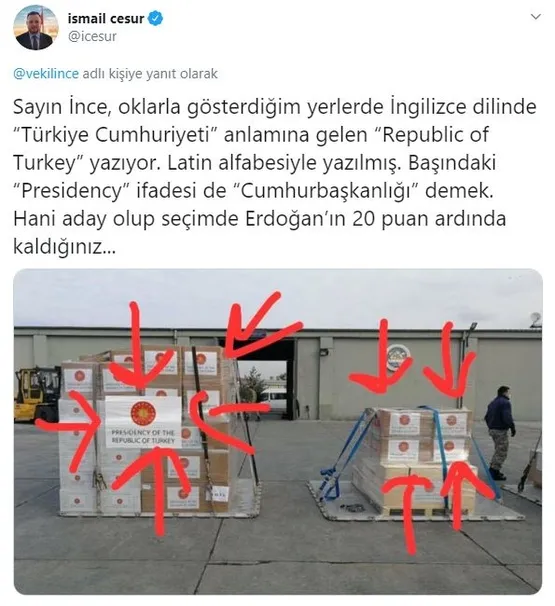Cumhurbaşkanı Danışmanı İsmail Cesur da İnce'ye tepki gösterdi. Cesur "Sayın İnce, oklarla gösterdiğim yerlerde İngilizce dilinde "Türkiye Cumhuriyeti" anlamına gelen "Republic of Turkey" yazıyor. Latin alfabesiyle yazılmış. Başındaki "Presidency" ifadesi de "Cumhurbaşkanlığı" demek. Hani aday olup seçimde Erdoğan'ın 20 puan ardında kaldığınız..." ifadeleriyle tepki gösterdi.