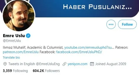 FETÖ firarisi Emre Uslu'nun da Twitter hesabı mavi tık olarak görünüyor ve herhangi bir şekilde müdahale edilmiyor.