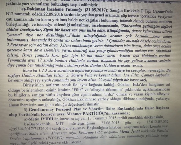"Filiz'le albaylığımda aramız çok bozuldu.... Ama zaten bulunmamış. Annemde iki çanta var onları bana getirin. 1.Çantada; Mustafa Önsel'e açılan dava, 2.Fetösavar için açılan dava, 3.Beni mahkemeye veren doktorların isim listesi, daha önce açılan gazeteye karşı dava işlemleri, Yavuz Demirağ için yazıp göndermediğim mektup var. (abdullah bilsin), İkinci çantada kara gün için 10 bin dolar vardı. Avukat için Haldun'a verdim. Temmuzda ayın 17 sinde bunları Haldun'a verdim. Başımıza bir şey gelirse avukata verirsin diye çünkü ben tutuklandığımda avukatım yoktu. Bunları Haldun avukata vermiş. Bana bu 1,2,3 soru sorulursa defterine yazmışsın nedir diye bu cevapları vereceğim. Bu sayfayı Haldun Abdullah bilsin, 2. Soruyu Filiz ve Levent bilsin, 1.yi Filiz, Çantayı kaybedin. Levent'in aldığı şey siyah çantamda onu levent alsın."