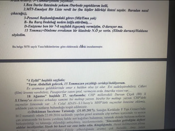 Tebliğnamede; içeriği itibariyle sanık Metin İyidil'e ait olduğu belirlenen dokümanlara ilişkin arama tutanağına yer verildi.