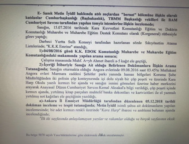 Tutanakta; sanık Metin İyidil'in oturmakta olduğu Angora evlerinde 9 Ağustos 2016 saat 03.45'te Mutlukent Angora Evleri Marmara Caddesi Şehitler Parkı yanında Hassas Bölgeleri Koruma Şube Müdürlüğü'nden iki polisin çöp konteynırında içi dolu siyah bir çöp poşeti ve üzerinde Kara Harp Okulu yazılı kırmızı bir ajanda ve sanık Metin İyidil'in ismini görmeleri üzerine haber merkezini arayarak Anayasal Düzen Cumhuriyet Savcısı Kemal Aksakal'a bilgi verildiği, çöp poşeti içinde kırmızı ajanda, yırtılmış kitap parçaları muhtelif banka dekontları ve kartvizitleri ile el yazmalı yırtılmış not kağıtları ele geçtiğine dikkat çekildi.