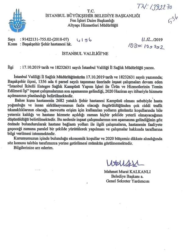 İstanbul Büyükşehir Belediyesi Genel Sekreter Yardımcısı Mehmet Murat Kalkanlı'nın İstanbul Valiliği'ne gönderdiği yazıda; İstanbul Büyükşehir Belediyesi'nin, Başakşehir Şehir Hastanesi'nin bağlantı yollarıyla ilgili çalışma yapamayacağı belirtilerek, "Kurumumuzun içinde bulunduğu ekonomik koşullar ve 2020 bütçemiz dikkate alındığında söz konusu talebin tarafımızca yerine getirilmesi mümkün görülmemektedir" denildi.