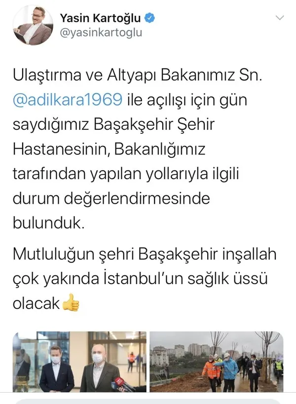 Yasin Kartoğlu, sosyal paylaşım sitesi Twitter'daki şahsi hesabından açıklamada bulundu ve "Ulaştırma ve Altyapı Bakanımız Sayın Adil Karaismailoğlu ile açılışı için gün saydığımız Başakşehir Şehir Hastanesinin, Bakanlığımız tarafından yapılan yollarıyla ilgili durum değerlendirmesinde bulunduk. Mutluluğun şehri Başakşehir inşallah çok yakında İstanbul'un sağlık üssü olacak" dedi.