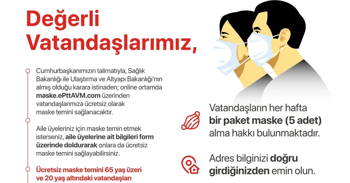 Cumhurbaşkanımız @RTErdogan'ın talimatıyla, Sağlık ve Ulaştırma Altyapı Bakanlığı'nın koordinasyonunda 20-65 yaş arası vatandaşlarımıza maske dağıtılacaktır.https://t.co/ALe3X42uwn adresindeki formu dolduran her vatandaşımızın evine haftada 5 adet maske teslim edilecektir. pic.twitter.com/2CWDpFKyjj