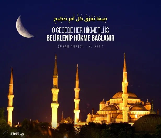 Erdoğan, iletisinde Duhan Suresi'nin "O gecede her hikmetli iş belirlenip hükme bağlanır." ifadelerini içeren 4. ayetinin yer aldığı görseli de paylaştı.