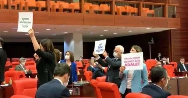 Ceza infaz yasasına başta terör olmak üzere tüm suçların dahil edilmesini isteyen HDP'liler Meclis geleneğine aykırı davranarak ellerinde dövizlerle protesto yaptı. HDP'li vekillerin elindeki dövizlerde, "Eşit infaz yaşatır", "Korona mahpus ayırmıyor", "İnfazda eşitlik, herkes için adalet" yazıları dikkat çekti.
