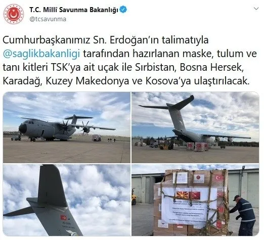 Milli Savunma Bakanlığı'nın Twitter hesabından yapılan açıklamada, "Cumhurbaşkanımız Sayın Recep Tayyip Erdoğan'ın talimatıyla Sağlık Bakanlığı tarafından hazırlanan maske, tulum ve tanı kitleri TSK'ya ait uçak ile Sırbistan, Bosna Hersek, Karadağ, Kuzey Makedonya ve Kosova'ya ulaştırılacak" denildi.