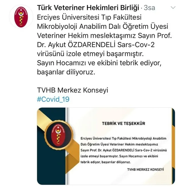 Türk Veteriner Birliği, sosyal medya hesabından, "Erciyes Üniversitesi Tıp Fakültesi Mikrobiyoloji Anabilim Dalı Öğretim Üyesi Veteriner Hekim meslektaşımız Sayın Prof. Dr. Aykut ÖZDARENDELİ Sars-Cov-2 virüsünü izole etmeyi başarmıştır. Sayın Hocamızı ve ekibini tebrik ediyor, başarılar diliyoruz. TVHB Merkez Konseyi #Covid_19" diye açıklama yaparak tebrik etti. Bilim insanı Özdarendeli, daha önce Kırım Kongo Kanamalı Ateşi aşısının insanlara yönelik denemelerinde başarı sağlamıştı.