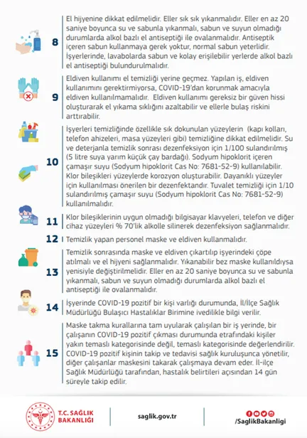 Ofislerde temizliğin nasıl yapılması gerektiğinin de anlatıldığı broşürde, "İş yerleri temizliğinde özellikle sık dokunulan yüzeylerin (kapı kolları, telefon ahizeleri, masa yüzeyleri gibi) temizliğine dikkat edilmelidir. Su ve deterjanla temizlik sonrası dezenfeksiyon için 1/100 sulandırılmış (5 litre suya yarım küçük çay bardağı). Sodyum hipoklorit içeren çamaşır suyu (Sodyum hipoklorit Cas No: 7681-52-9) kullanılabilir. Klor bileşikleri yüzeylerde korozyon oluşturabilir. Dayanıklı yüzeyler için kullanılması önerilen bir dezenfektandır. Tuvalet temizliği için 1/10 sulandırılmış çamaşır suyu (Sodyum hipoklorit Cas No: 7681-52-9) kullanılmalıdır. Klor bileşiklerinin uygun olmadığı bilgisayar klavyeleri, telefon ve diğer cihaz yüzeyleri % 70'lik alkolle silinerek dezenfeksiyon sağlanmalıdır. Temizlik yapan personel maske ve eldiven kullanmalıdır. Temizlik sonrasında maske ve eldiven çıkartılıp iş yerindeki çöpe atılmalı ve el hijyeni sağlanmalıdır. Yıkanabilir bez maske kullanıldıysa yenisiyle değiştirilmelidir. Eller en az 20 saniye boyunca su ve sabunla yıkanmalı, sabun ve suyun olmadığı durumlarda alkol bazlı el antiseptiği ile ovalanmalıdır" açıklamasında bulunuldu.