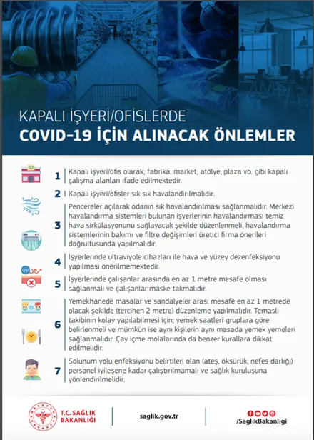 Sağlık Bakanlığınca kapalı ortamda çalışılan iş yerlerinde ve ofislerde yeni tip corona virüs (Covid-19) salgınına karşı alınabilecek önlemlere ve olası vak'a durumunda yapılması gerekenlere ilişkin bir bilgilendirme paylaşıldı. Broşürde, kapalı ortamda çalışılan iş yeri ve ofis olarak; fabrika, market, atölye, plaza gibi kapalı ortamda çalışılan çalışma alanlarının ifade edildiği belirtildi. Kapalı ortamda çalışılan iş yerlerinin sık sık havalandırılması gerektiği aktarılan broşürde, "Pencereler açılarak odanın sık havalandırılması sağlanmalıdır. Merkezi havalandırma sistemleri bulunan iş yerlerinin havalandırması temiz hava sirkülasyonunu sağlayacak şekilde düzenlenmeli, havalandırma sistemlerinin bakımı ve filtre değişimleri üretici firma önerileri doğrultusunda yapılmalıdır" denildi.
