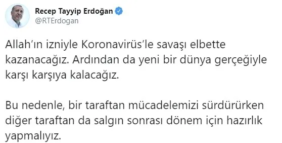 Erdoğan yaptığı infografik paylaşımında "Allah'ın izniyle Koronavirüs'le savaşı elbette kazanacağız. Ardından da yeni bir dünya gerçeğiyle karşı karşıya kalacağız. Bu nedenle, bir taraftan mücadelemizi sürdürürken diğer taraftan da salgın sonrası dönem için hazırlık yapmalıyız." ifadelerine yer verdi.