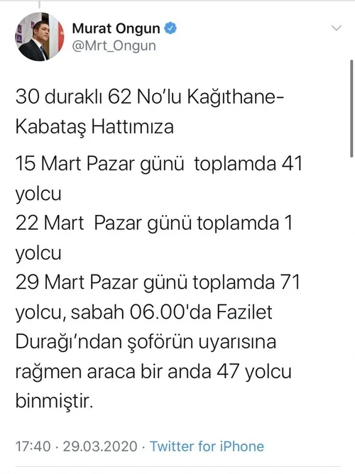 Murat Ongun; "30 duraklı 62 No'lu Kağıthane-Kabataş Hattımıza 15 Mart Pazar günü toplamda 41 yolcu, 22 Mart Pazar günü toplamda 1 yolcu, 29 Mart Pazar günü toplamda 71 yolcu, sabah 06.00'da Fazilet Durağı'ndan şoförün uyarısına rağmen araca bir anda 47 yolcu binmiştir" iddiasında bulundu.