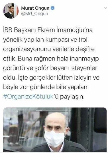 Ongun, sosyal paylaşım sitesi Twitter'daki şahsi hesabından; "İBB Başkanı Ekrem İmamoğlu'na yönelik yapılan kumpası ve trol organizasyonunu verilerle deşifre ettik. Buna rağmen hala inanmayıp görüntü ve şoför beyanı isteyenler oldu. İşte gerçekler lütfen izleyin ve böyle zor günlerde bile yapılan #OrganizeKötülük'ü paylaşın" iddiasında bulundu.