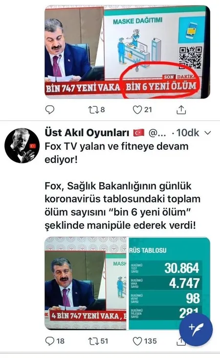 Amerikan sermayesiyle Türkiye'de tetikçilik yapan FOX TV, Sağlık Bakanı Fahrettin Koca'nın dün akşam verdiği koronavirüs salgını ile ilgili son rakamları çarpıttı. Bakan Koca yeni vefat sayısının 98 olduğunu belirtmesine, o sırada günlük tablo da yayınlanmasına rağmen FOX TV ekranındaki başlıkta yeni ölüm sayısı 1006 olarak gösterildi.
