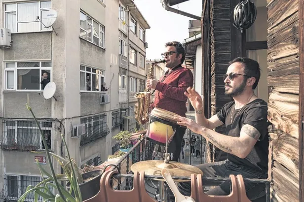 İstanbul Kadıköy'de yaşayan iki müzisyen Hakan Kaya (sağda) ve Alper Kalaycıklıoğlu, komşuları için balkondan konser veriyor.
