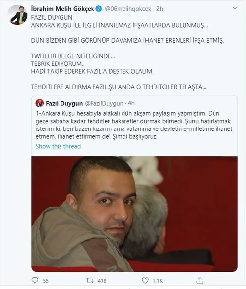 2- Melih Gökçek tarafından 2016 yılında " Ankara Kuşu hesabı Fetöcü" denilmesine rağmen dikkate alınmadığı sanıldı. Oysa ki, devlet, kuşun tüm irtibatlarıyla Ak Parti içinde temizlik düğmesine bastı. Kuş hiçbir zaman Ak Partili olmadı.