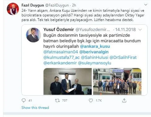 24- Yarın akşam, Ankara Kuşu üzerinden ve kimin talimatıyla hangi siyasi ve bürokratlara operasyon çekildi? Hangi siyasi aday adaylarından Oktay Yaşar para aldı. Tek tek belgeleriyle paylaşacağım. Lütfen hesabıma destek.