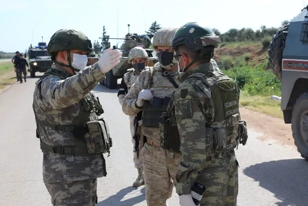 Fotoğraflarda, Mehmetçiğin yeni tip koronavirüse (Kovid-19) karşı maske ve eldiven kullandığı görüldü.