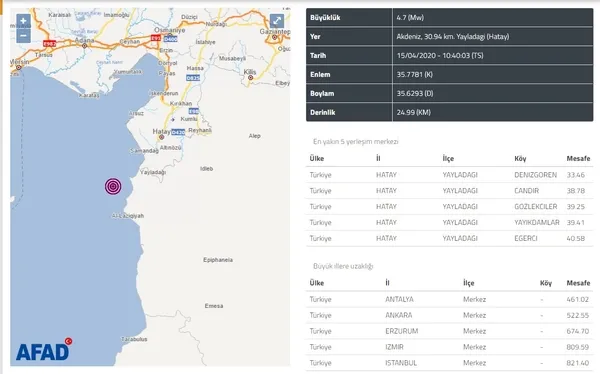 AFAD'dan yapılan açıklamada, "Akdeniz'de Hatay, Yayladağı açıklarında saat 10.40'ta 4,7 büyüklüğünde bir deprem meydana gelmiştir. Akdeniz'de Yayladağı açıklarında meydana gelen 4,7 büyüklüğündeki deprem sonrası, an itibarıyla, olumsuz bir ihbarın bulunmadığı bilgisi alınmıştır. Gelişmeleri takip ediyoruz." denildi.