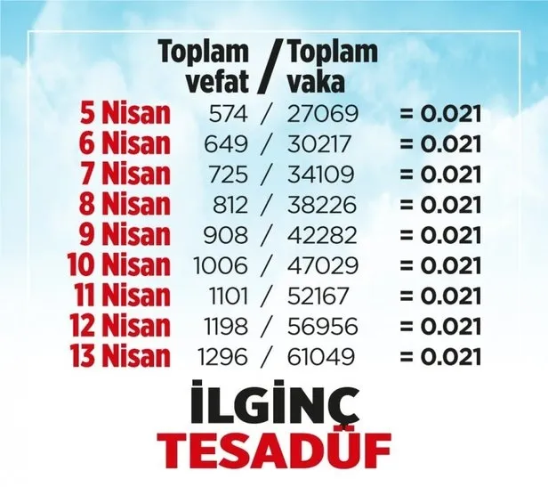 Akpolat yazısında, "Koronavirüsün tıbbi boyutu için oran hesabı yani olasılık kullanılır. Örneğin İtalya'nın 12 Nisan tarihli verilerini alalım, yaklaşık 150bin hasta, 19bin ölüm, yani ölüm oranı %10'dan fazla. Bu veriler Amerika için 500bin hasta, 20bin ölüm, yaklaşık %5, Almanya için 125bin hasta, 3bin ölüm, yaklaşık %2.5. Ülkemizde ölüm oranı şu anda %2.5 civarında. Bu oranların bu şekilde çıkmasının tek sebebi paydadaki rakamın yüksekliğidir." dedi.