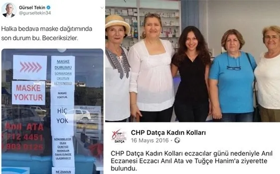 CHP Milletvekili Gürsel Tekin dün sosyal medya hesabından bir eczanenin fotoğrafını paylaştı. Söz konusu fotoğrafta maske ile ilgili eczane camına asılmış çeşitli duyurular yer alıyordu. Duyurularda maske olmadığı ücretsiz maskelerin henüz ellerine ulaşmadığı iddia ediliyordu. Gürsel Tekin bu paylaşımıyla eczanelerde maske kaosu yaşandığı algısı oluşturmaya çalıştı. Fakat söz konusu eczanenin CHP Datça Kadın Kolları ile irtibatlı bir eczane olduğu ortaya çıktı.
