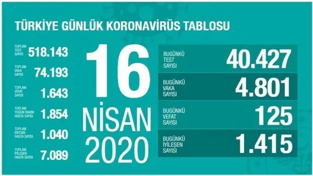 Sağlık Bakanlığının internet sitesinde yer alan "Türkiye Günlük Koronavirüs Tablosu"nun güncel verilerine göre, dün test sayısı 40 bin 427, vaka sayısı 4 bin 801, iyileşen hasta sayısı 1415, vefat sayısı ise 125 olarak kayıtlara geçti.