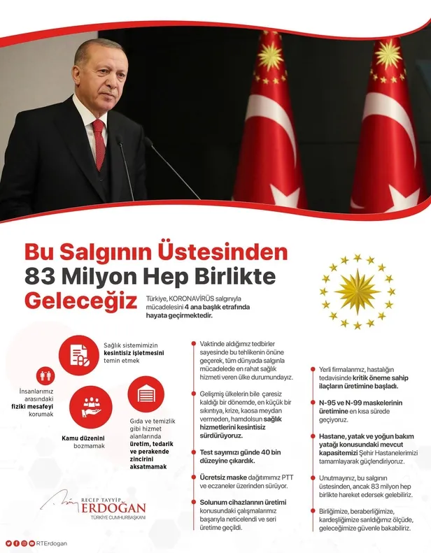 Cumhurbaşkanı Erdoğan, salgının üstesinden 83 milyon birlikte hareket ederek gelinebileceğini vurgularken, "Birliğimize, beraberliğimize, kardeşliğimize sarıldığımız ölçüde geleceğimize güvenle bakabiliriz. Türkiye'den başka ülkemiz, bu topraklardan başka vatanımız, bu milletten başka sinesine sığındığımız, sığınacağız ve hizmet edeceğimiz halk yoktur. İstikbalimize ve istiklalimize, terör örgütlerinin saldırılarına, darbe girişimlerine, vesayetin tuzaklarına, bütün bunlara karşı nasıl hep birlikte sarıldıysak, bugün de salgın hastalığa karşı aynı azimle sahip çıkacağız." ifadelerini kullandı.