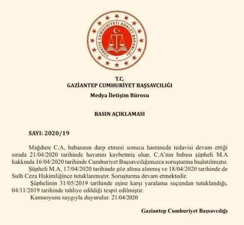 Gaziantep Cumhuriyet Başsavcılığı, C. A.'nın babasının darp etmesi sonucu tedavisi devam ettiği sırada 21 Nisan 2020 tarihinde hayatını kaybettiğini ifade etti. C.A'nın babası şüpheli M.A hakkında 16 Nisan 2020 tarihinde Cumhuriyet Başsavcılığı'nca soruşturma başlatıldığı belirtti. Şüphelinin 17 Nisan 2020 tarihinde göz altına alındığı, 18 Nisan 2020 tarihinde çıkarıldığı Sulh Ceza Hakimliği'nce tutuklandığı ifade edildi. Soruşturmanın ise devam ettiği kaydedildi.