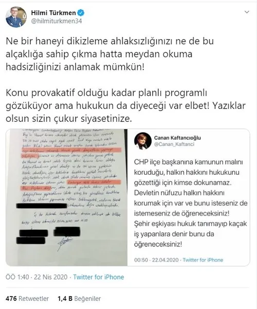 Üsküdar Belediye Başkanı Hilmi Türkmen, Canan Kaftancıoğlu'nu eleştirerek, "Ne bir haneyi dikizleme ahlaksızlığınızı ne de bu alçaklığa sahip çıkma hatta meydan okuma hadsizliğinizi anlamak mümkün! Konu provakatif olduğu kadar planlı programlı gözüküyor ama hukukun da diyeceği var elbet! Yazıklar olsun sizin çukur siyasetinize" ifadelerini kullandı.
