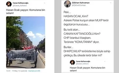 Türkiye'deki terör örgütlerinin savunuculuğu üstlenen CHP'li Canan Kaftancıoğlu, DHKP-C'nin ölüm orucunca ölen Helin Bölek için CHP amblemli taziye mesajını sosyal medya hesabından paylaştı. MLKP terör örgütünün kurucu üyelerinden olan Hasan Ocak için de sosyal medya hesabından ileti paylaşmış olan Kaftancıoğlu, "Hasan Ocak yaşıyor. Komutana bin selam!" dedi. Bir teröristte komutan diyen Kaftancıoğlu, vatan için şehit olanların şehadetini ise dalga konusu yaptı.