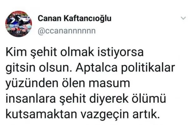 Terör örgütlerine karşı mücadele edip şehit olan kolluk kuvvetlerinin şehadetine bile tahammül edemeyen Kaftancıoğlu, "Kim şehit olmak istiyorsa gitsin olsun. Aptalca politikalar yüzünden ölen masum insanlara şehit diyerek ölümü kutsamaktan vazgeçin artık!" demişti.