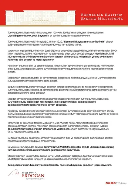 "Türkiye Büyük Millet Meclisi'nin kuruluşunun 100. yılını, Türkiye'nin ve dünyanın tüm çocuklarının Ulusal Egemenlik ve Çocuk Bayramı'nı en samimi duygularımla tebrik ediyorum. Türkiye Büyük Millet Meclisi'nin açıldığı 23 Nisan 1920, 'Egemenlik kayıtsız şartsız milletindir' diyerek bağımsızlığımızı ve milli iradenin hakimiyetini dünyaya ilan ettiğimiz tarihtir. Vatanımızın işgal edildiği, milletimizin özgürlüğüne ve geleceğine kastedildiği hayati bir dönemde açılan Büyük Millet Meclisimiz, istikbal mücadelemizin ve bağımsızlığa giden yolun öncüsü olmuştur. Meclisimizin, Milli Mücadelemizde gönüllerde yaktığı ateş en karanlık günlerde aziz milletimizin yolunu aydınlatmış, halkımıza güç, cesaret ve moral aşılamıştır"