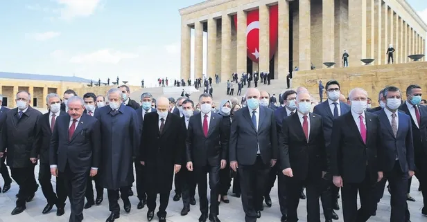 Aslanlı Yol'dan yürüyerek Atatürk'ün mozolesine gelen heyet, TBMM Başkanı Şentop'un mozoleye çelenk bırakmasının ardından saygı duruşunda bulundu ve İstiklal Marşı'nı okudu.