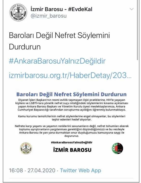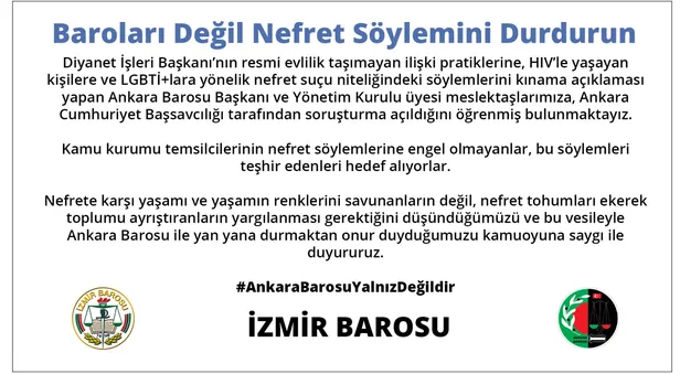 "Diyanet İşleri Başkanı'nın resmi evlilik taşımayan ilişki pratiklerine, HIV'le yaşayan kişilere ve LGBTİ+lara yönelik nefret suçu niteliğindeki söylemlerini kınama açıklaması yapan Ankara Barosu Başkanı ve Yönetim Kurulu üyesi meslektaşlarımıza, Ankara Cumhuriyet Başsavcılığı tarafından soruşturma açıldığını öğrenmiş bulunmaktayız."