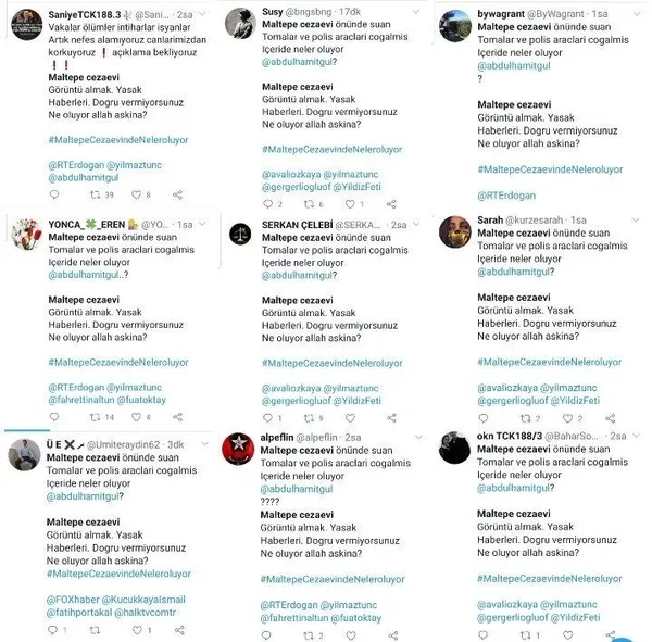 "#MaltepeCezaevindeNeleroluyor" etiketi altında yapılan provokatif paylaşımların FETÖ'cü hainlere ait bot hesaplar olduğu anlaşıldı. Bazı sosyal medya kullanıcıları "Paylaşımların hepsi aynı, hastalıklı zihniyet ve uşakları işbaşında" şeklinde tepkilerini dile getirdi.
