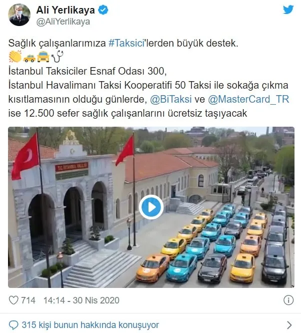 İstanbul Valisi Ali Yerlikaya, Twitter hesabından yaptığı açıklamada, 12 bin 500 taksinin seferi ile sağlık çalışanlarını ücretsiz taşınacağını duyurdu.