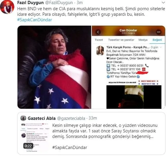 Can Dündar, Twitter'da porno izlerken yakalandı. Sosyal medyada ahlaksızlığın özgür olmasından faydalanan bir hesabın yayınladığı görüntüyü izleyen Dündar, videonun beğenme tuşuna bastı. Bu haber yazılırken Dündar'ın Twitter hesabında video halen duruyordu.