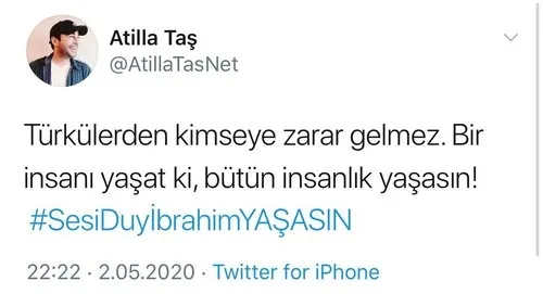ATİLLA TAŞ: Fetullahçı Terör Örgütü'nden hüküm yiyen Atilla Taş ise "Türkülerden kimseye zarar gelmez. Bir insanı yaşat ki, bütün insanlık yaşasın! #SesiDuyİbrahimYAŞASIN" dedi.