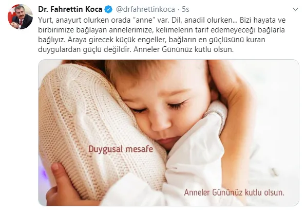 Bakan Koca sosyal medya hesabından, yaptığı paylaşımda "Yurt, anayurt olurken orada 'anne' var. Dil, anadil olurken... Bizi hayata ve birbirimize bağlayan annelerimize, kelimelerin tarif edemeyeceği bağlarla bağlıyız. Araya girecek küçük engeller, bağların en güçlüsünü kuran duygulardan güçlü değildir. Anneler Gününüz kutlu olsun" ifadelerini kullandı.