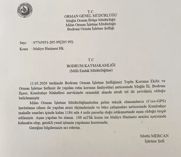 Milas Orman İşletme Müdürlüğümüzden gelen teknik elemanlarca (Cors-GPS) haritalama cihazı ile yapılan arazi ölçümlerinde ve büro çalışmaları neticesinde Kumbahçe mahalle sınırları içinde kalan 1184 ada 4 nolu parselin doğu istikametinde aşım olduğu tespit edilmiştir. Aşım yapılan bu alanın 188 metrekarelik kısmı ise Maliye Hazinesi arazisi içerisinde kalmakta olup gerekli yasal işlemin yapılması hususunda, gereğini bilgilerinize arz ederim."