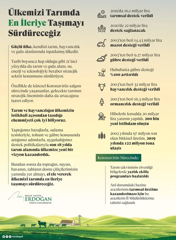 Cumhurbaşkanı Erdoğan, paylaşımında çiftçilere koronavirüs süreci öncesi ve sonrası verilen desteklerin bulunduğu bir görsele de yer verdi.