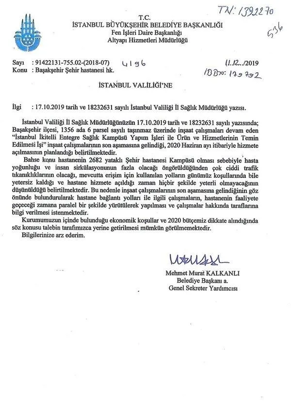 İstanbul Büyükşehir Belediyesi Genel Sekreter Yardımcısı Kalkanlı'nın, 11 Aralık 2019 tarihinde İstanbul Valiliği'ne gönderdiği yazıda şöyle deniliyor: